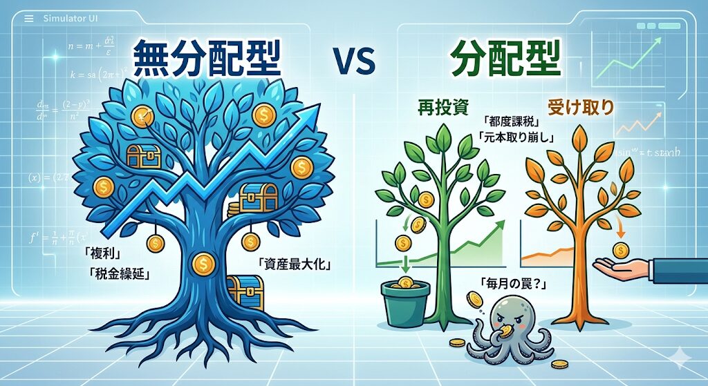 資産を最大化するという目的において、分配型は構造的に不利です。
