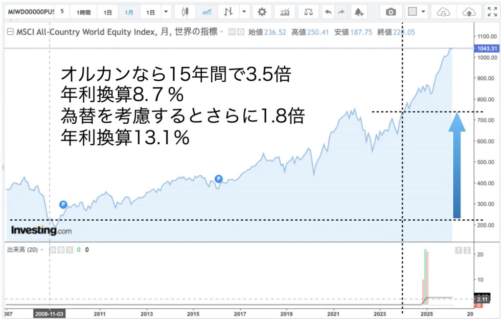まずACWIの指数がこの保険加入期間15年でどう変化したのかがこれ。為替を含めると年利で13%というとんでもないリターンを記録している。