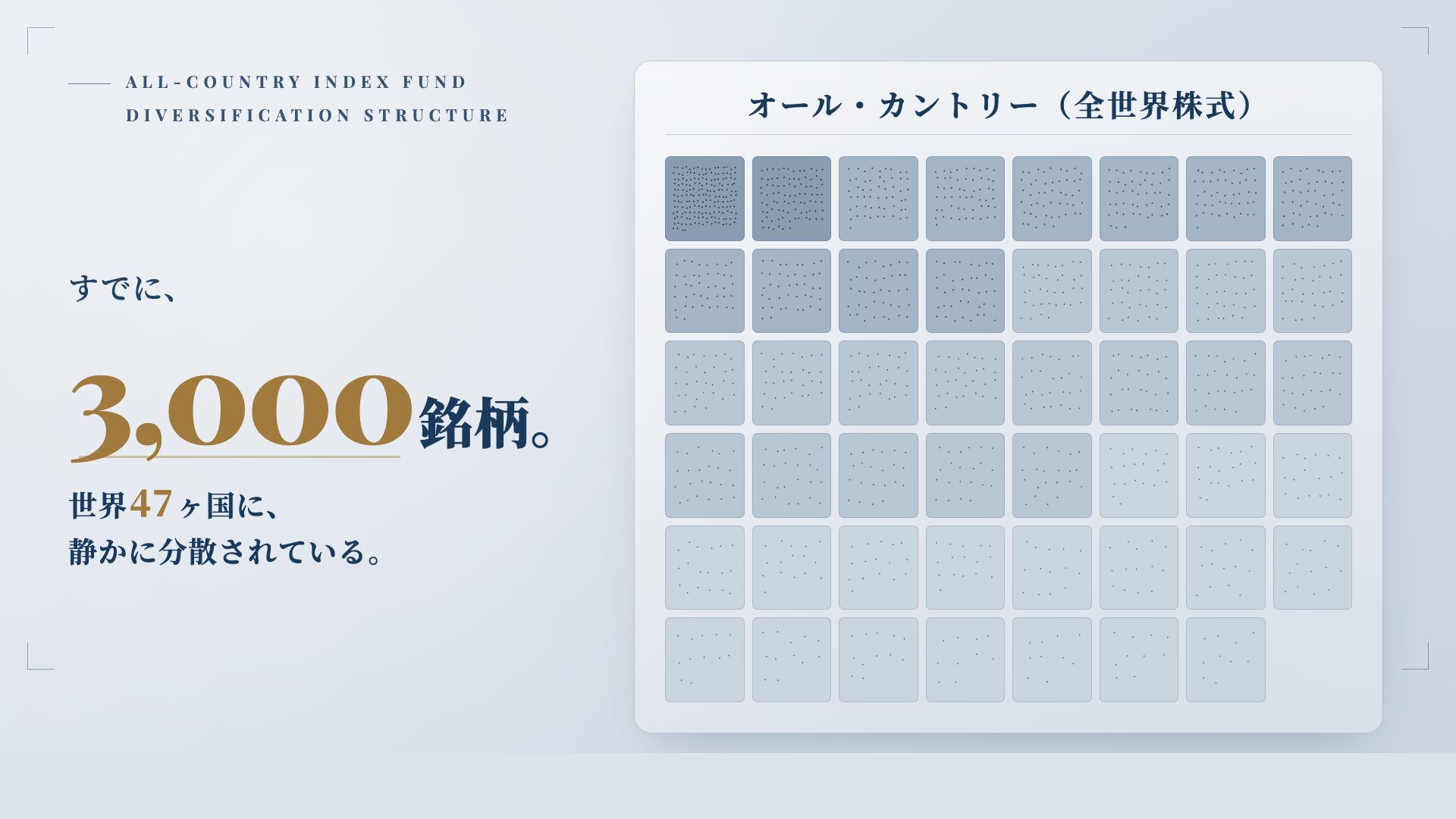 このとき、あなたが持っているのは「2つの籠」ではありません。そのファンドの中で、卵はすでに47ヶ国・約3,000個の籠に分けて盛られている状態です。