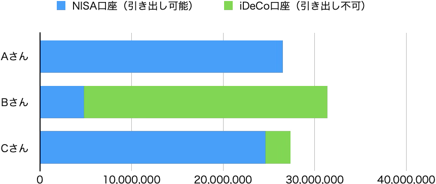 3パターンそれぞれの45歳時点の資産額を口座別にみてみましょう。