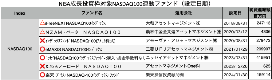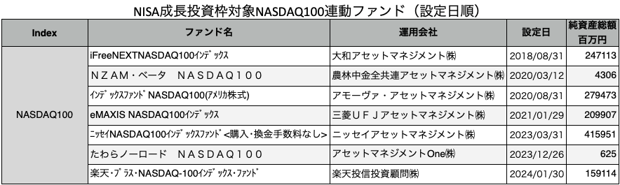 今回比較対象とするのはNISA成長投資枠で購入できるNASDAQ100連動のファンドです。