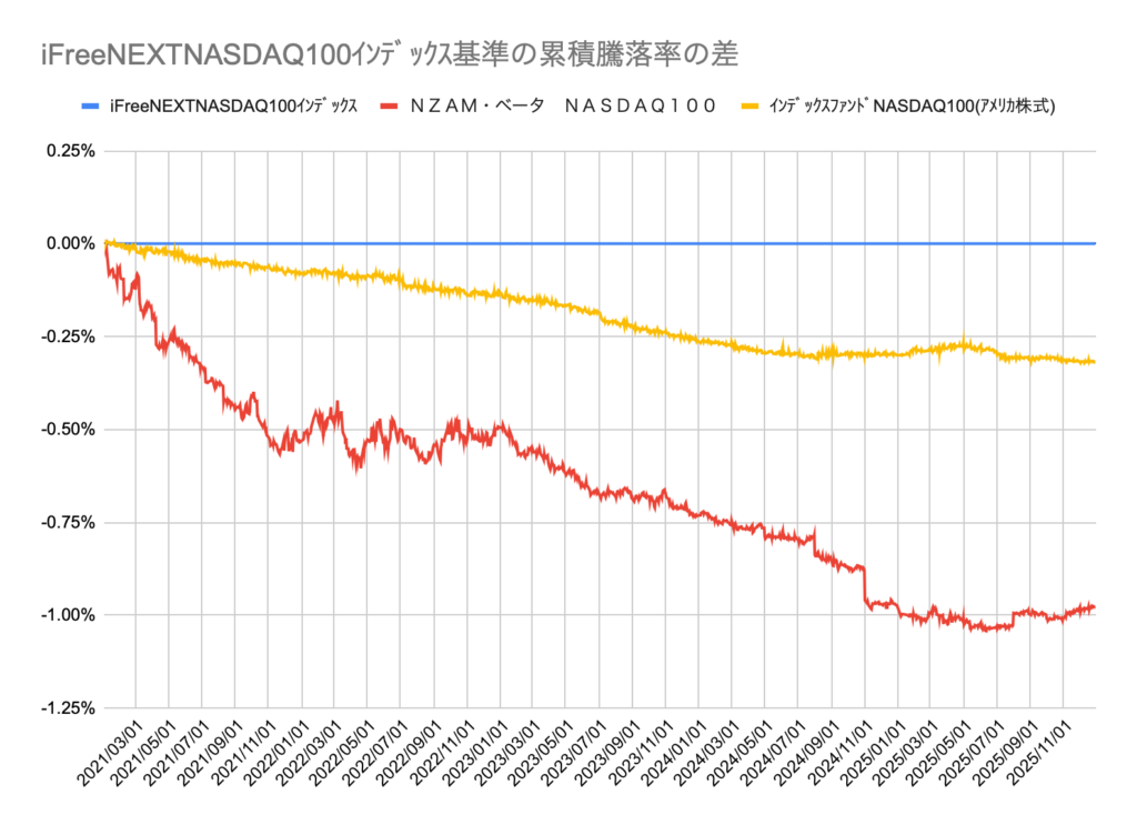 見方としては、2021年1月1日にiFreeNEXT NASDAQ100インデックスとNZAM・ベータ NASDAQ100を同じ金額分購入したら、5年後の評価額には1%の差がついていた。ということになります。