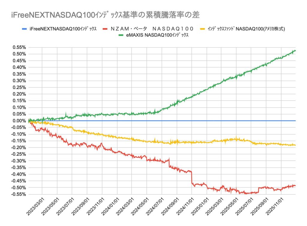 3本の中で最も設定日の古いiFreeNEXT NASDAQ100インデックスを基準に、日々の騰落率にどれだけ差があったかを算出し、その差を5年間累積したグラフです。