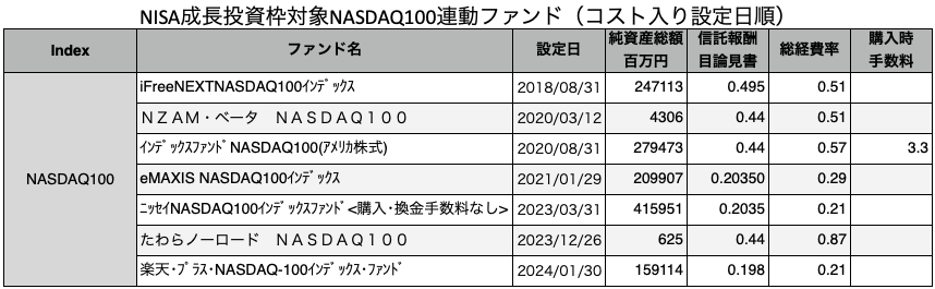 NASDAQ100連動ファンド6本は、目論見書からわかるコストが特徴的でしたので、コストを含めた一覧にしてみました。