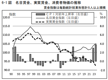 - しかしインフレを考慮した「実質賃金」は右肩下がり