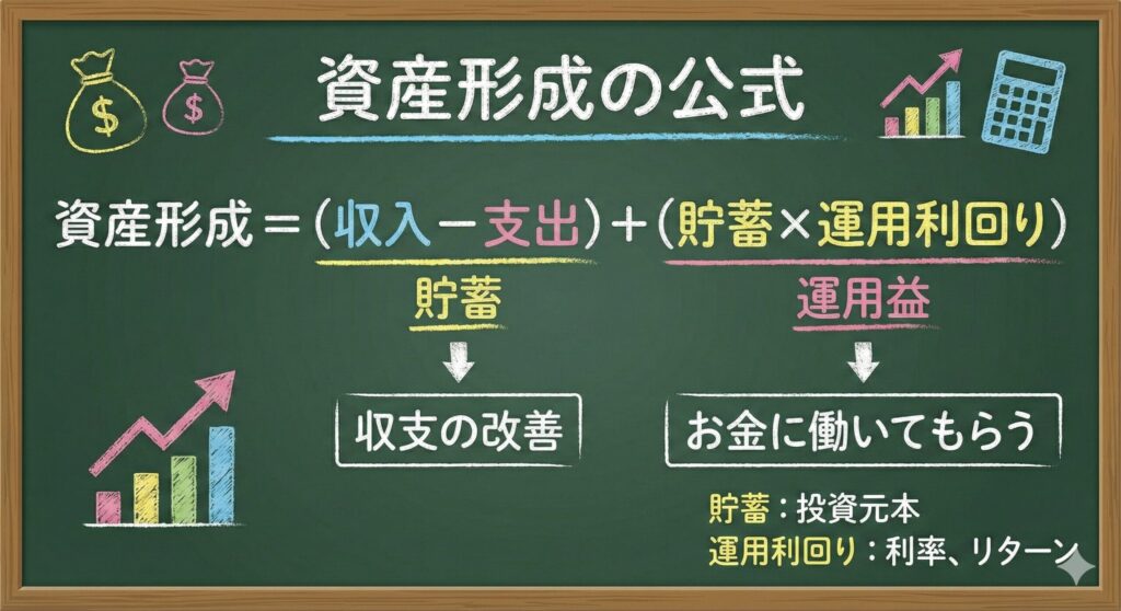 資産形成=(収入-支出)+(貯蓄×運用利回り)